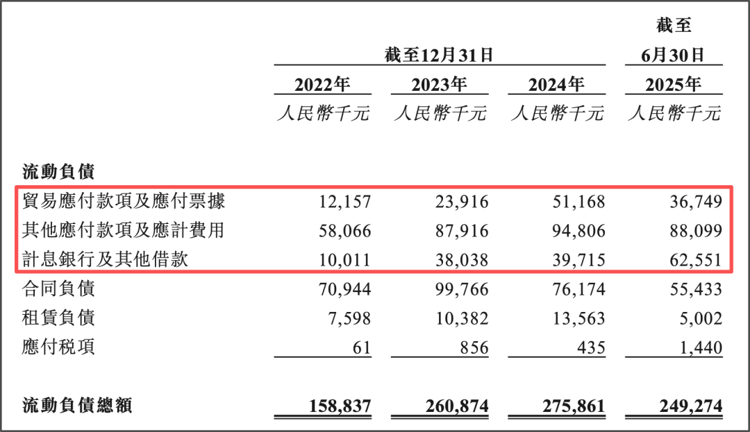与之相对的是,2022—2025年上半年,海纳医药仅流动负债中的贸易应付款项及应付票据、其他应付款项及应计费用、计息银行及其他借款总计约为0.8亿元、1.5亿元、1.86亿元、1.88亿元,呈快速上升的态势,且已明显高于在手现金数额。