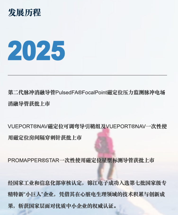 官网显示,2023年、2025年锦江电子分别有1款、3款产品获批上市,包括PulsedFA®一次性使用心脏压力脉冲电场射频消融导管、VUEPORT®NAV磁定位可调弯导引鞘组及VUEPORT®NAV一次性使用磁定位房间隔穿刺针等。