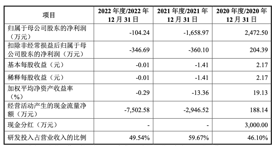 2020—2022年,锦江电子的研发投入占总营收比重分别为46.1%、59.67%、49.54%,同期经营现金流净额分别为188.14万元、-2946.52万元、-7502.58万元,同样由正转负。