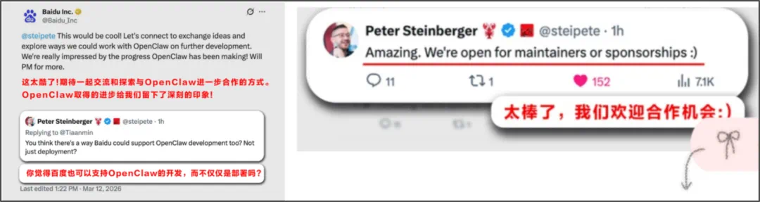 在点评腾讯版“龙虾”之后,3月12日,OpenClaw创始人PeterSteinberger在百度官方发布的多条OpenClaw相关海外社交帖子下接连点赞,并评论称“Amazing”,同时直接询问百度智能云能否支持OpenClaw的开发,“期待探索合作机会”,让这场AI智能体的赛道角逐增添了国际合作的想象力。