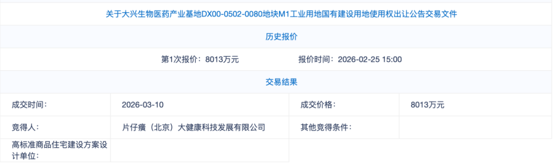 《星岛》从北京市规划和自然资源委员会官网了解到,片仔癀新获得的工业用地位于大兴生物医药产业基地,成交价格8013万元,占地面积约3.56万平方米,规划建筑面积约4.99万平方米。
