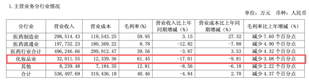 以2025年上半年为例,化妆品业务占片仔癀同期总营收的比重仅7%,约3.2亿元,且同比下滑17.01%,毛利率同样下滑了3.06个百分点,但61.45%的毛利率仍是所有业务中最高,按产品划分,也仅次于片仔癀这一大单品。