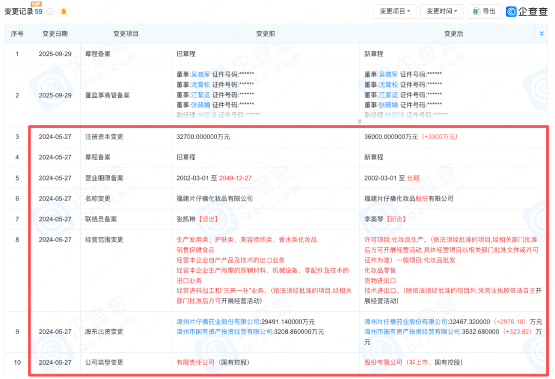 企查查显示,2025年9月,片仔癀化妆品备案了新的公司章程及董监高人员,但关于分拆上市,再未有更多公开信息披露。