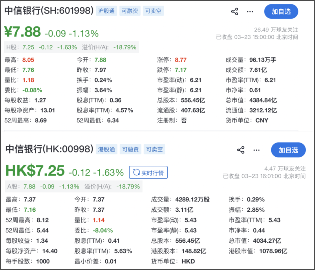 截至3月23日收盘,中信银行A股报7.88元/股,下跌1.13%,成交量95.13万手,成交额7.61亿元,总市值4384.84亿元;中信银行港股报7.25港元/股,下跌1.63%,成交量4289.12万股,成交额3.11亿港元,总市值4034.27亿港元。