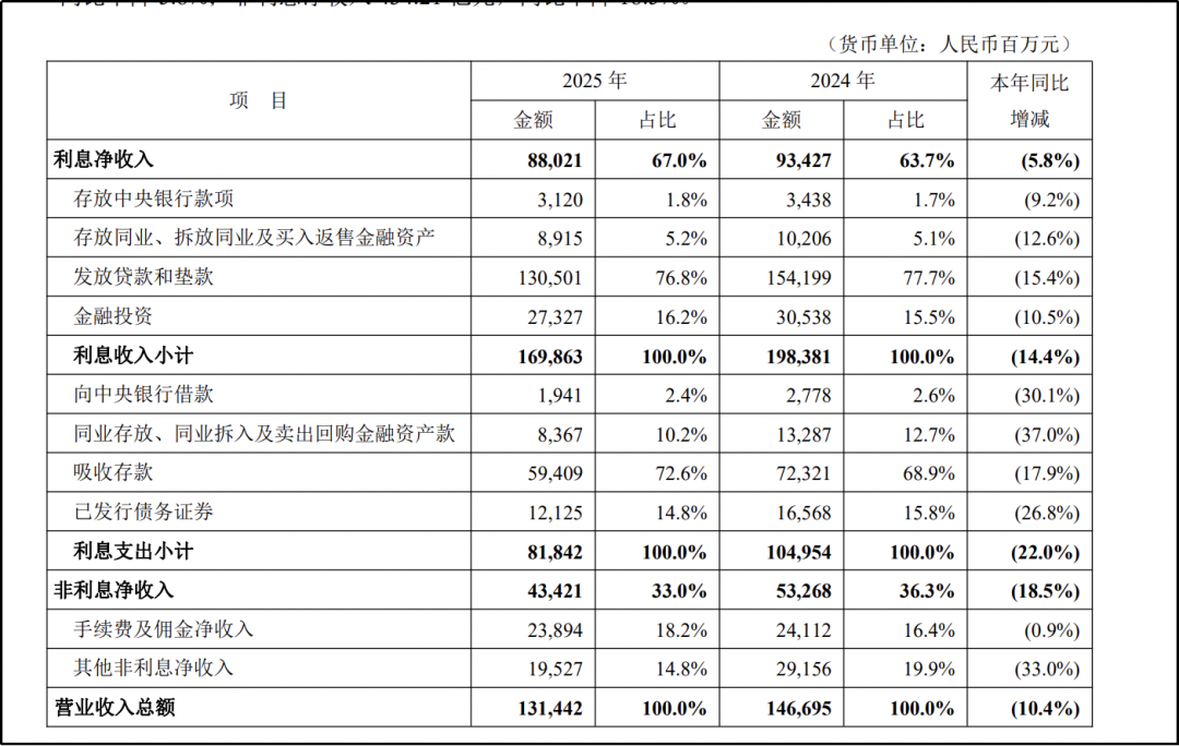非利息净收入的下滑进一步加剧了营收压力,全年实现434.21亿元,同比下降18.5%。其中手续费及佣金净收入238.94亿元,同比微降0.9%,银行卡手续费收入123.93亿元同比降5.9%,主因是信用卡业务手续费收入下滑,其他手续费及佣金收入40.50亿元同比降14.9%,源于理财老产品管理费收入减少;其他非利息净收入195.27亿元,同比大幅下降33.0%,成为非息收入下滑的主要拉动力。
