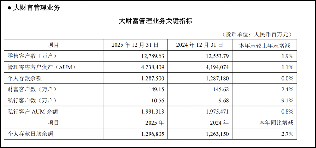 年报数据显示,截至2025年末,平安银行零售客户数较上年末增长仅1.9%,管理零售客户资产(AUM)较上年末仅增长1.1%,增势缓慢;私行客户增长最多,共10.56万户,较上年末增长9.1%。