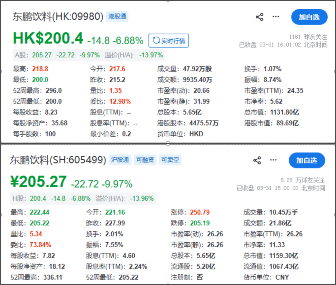 截至3月31日收盘,东鹏饮料A股跌9.97%,报205.27元/股;港股报200.4港元/股,下跌6.88%。
