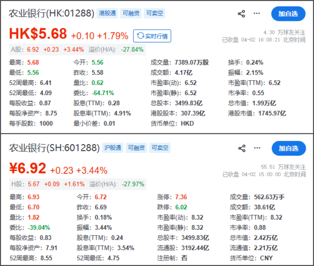 发布会当日,农业银行股票继开盘后持续走高。截至4月2日收盘,A股报6.92元/股,涨3.44%,总市值2.42万亿元;港股报5.68港元/股,上涨1.79%,总市值1.99万亿港元。