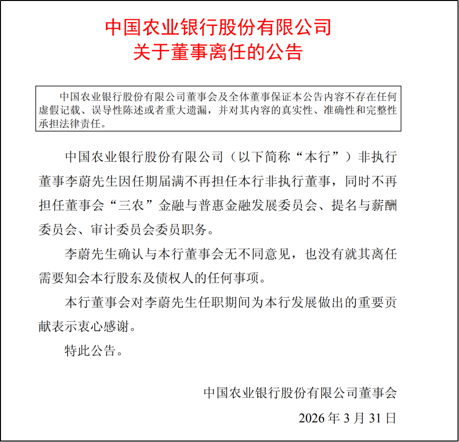 业绩发布会召开第二天,农业银行还发布公告称,董事李蔚因任期届满,不再担任该行执行董事。公开资料显示,李蔚出生于1966年5月,浙江宁波人,毕业于浙江财经学院财政专业,曾先后任职于财政部驻宁波市财政监察专员办事处和中央汇金投资有限责任公司。