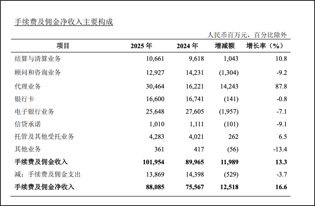 从具体业务板块来看,2025年农业银行手续费及佣金净收入表现亮眼,全年实现880.85亿元,较上年增加125.18亿元,同比增长16.6%。其中,代理业务同比增长87.8%,主要得益于该行深入推进财富管理业务转型,理财和代销基金收入稳步增加。
