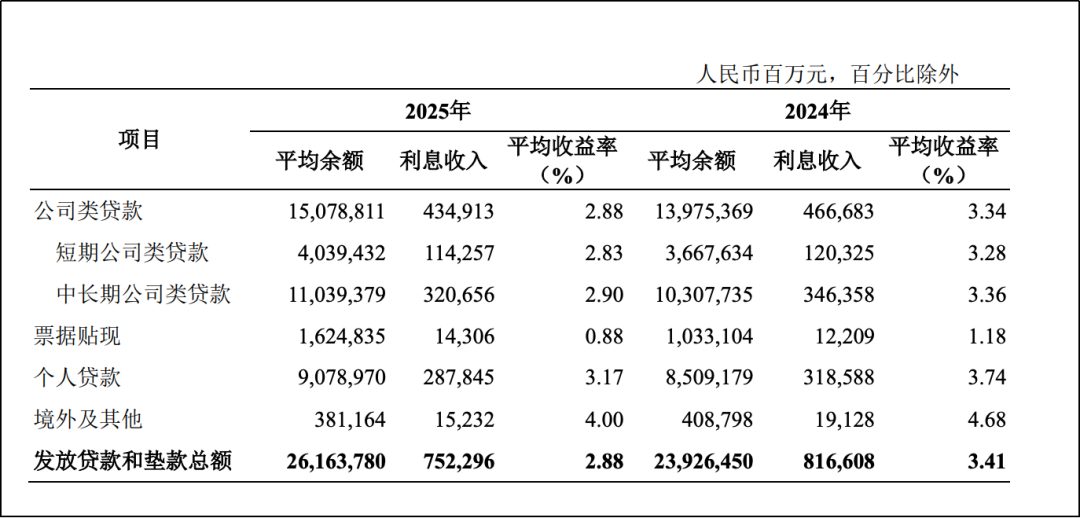 尽管消费贷款增长喜人,农业银行仍未能摆脱行业普遍面临的利息净收入下滑、净息差持续收窄的困境。2025年,在平均贷款余额同比上涨的情况下,该行公司、个人贷款利息收入均出现下降:公司贷款利息收入同比下滑6.8%,个人贷款利息收入同比下滑9.6%,平均收益率分别下降0.46和0.57个百分点;境外贷款表现更弱,平均余额和利息收入双双下滑,发放贷款金额下降2.22%,吸收存款金额下降2.0%。