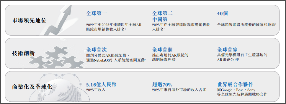 根据艾瑞咨询数据,2022—2025年XREAL连续四年位列全球AR眼镜市场销售收入第一;在更广义的智能眼镜市场中,XREAL在2025年排名全球第二,中国公司中排名第一。