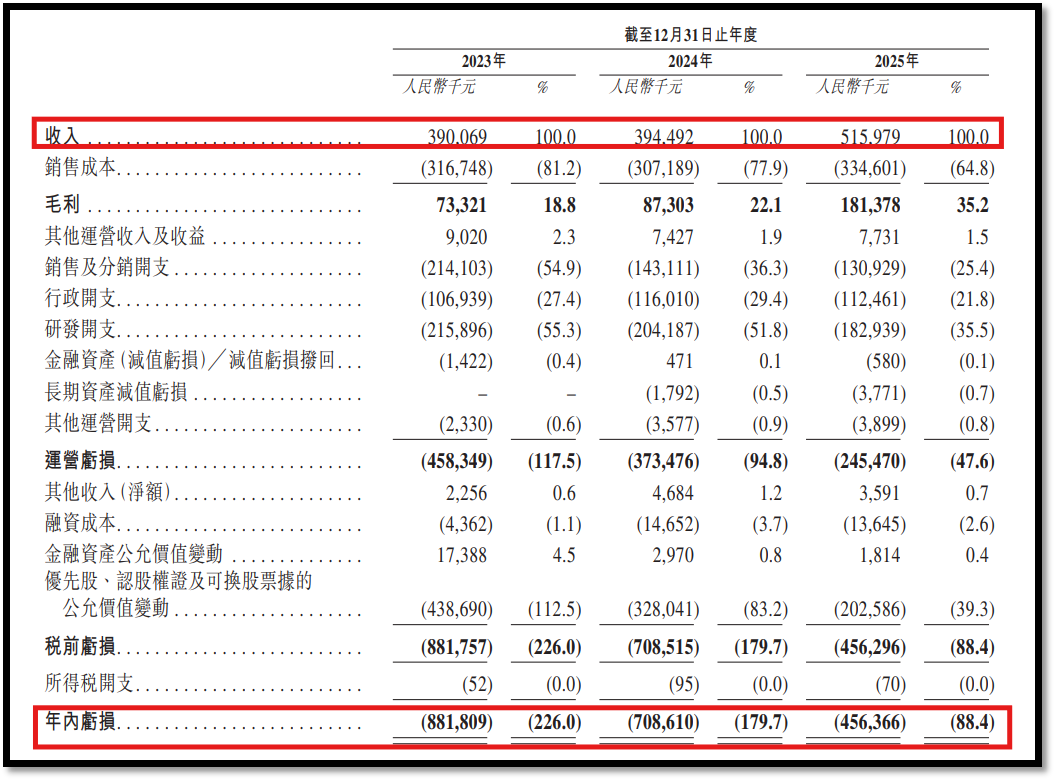 招股书显示,2023—2025年XREAL营收分别为3.90亿元、3.94亿元和5.16亿元,2025年同比增长30.8%。
