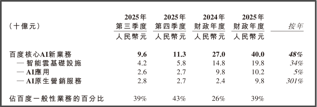 但在这份财报中,百度也首次明确披露了AI业务的独立收入,标志着其对业务结构的重大调整。公司将原“百度核心”重新定义为“一般性业务”,涵盖AI新业务、传统业务及其他板块。这一口径的变更,清晰传递出百度坚定推进AI转型的战略决心。