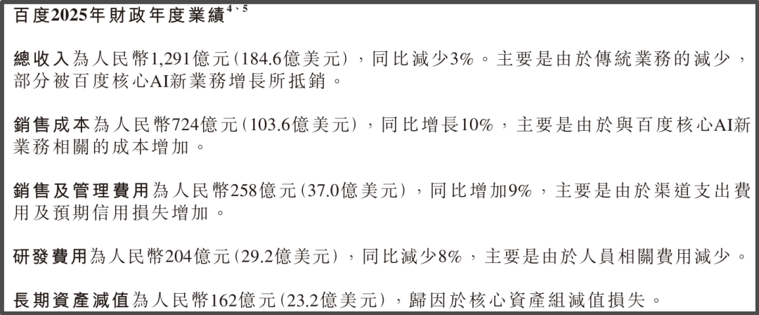 有人说,百度这是要“破釜沉舟”“背水一战”。但决绝走向AI的百度也付出了不小的代价,受计提162亿元长期资产减值的拖累,2025年百度的净利润同比下降了76%。