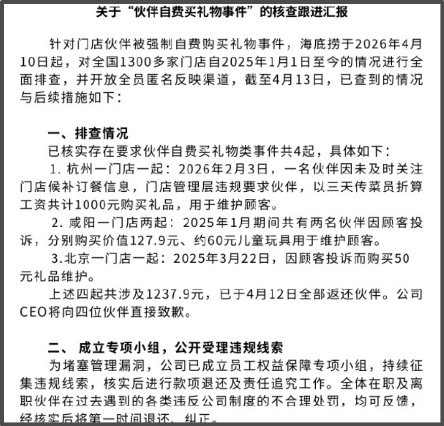 4月13日晚间,海底捞发布通告表示,自4月10日起,其对全国1300多家门店自2025年1月1日至今的情况进行全面排查,并开放全员匿名反映渠道。截至4月13日,海底捞已核实存在要求员工自费买礼物类事件共4起,涉及金额1237.9元,已于4月12日全部返还。