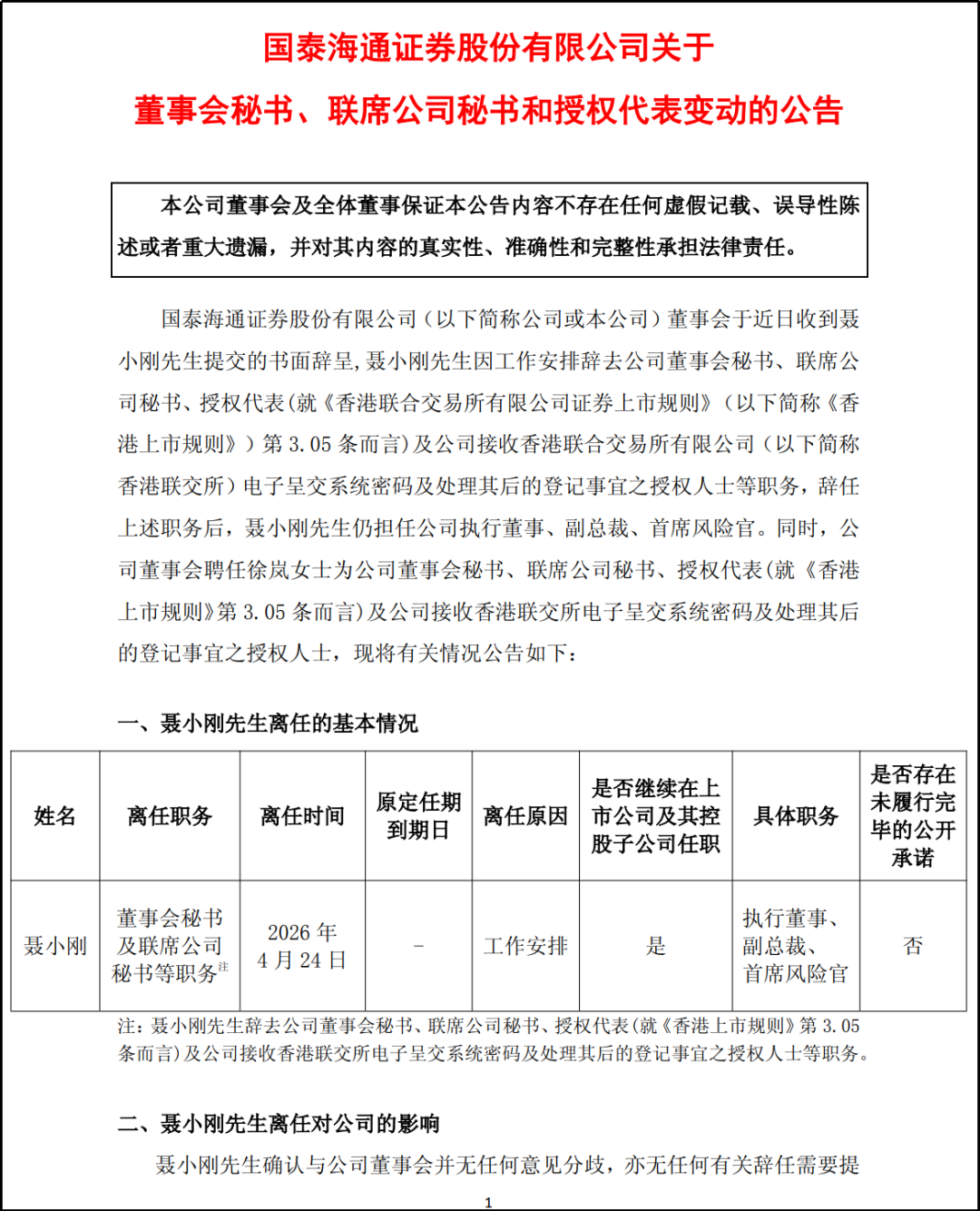 子公司合并落地,国泰海通同步换董秘:徐岚接棒聂小刚