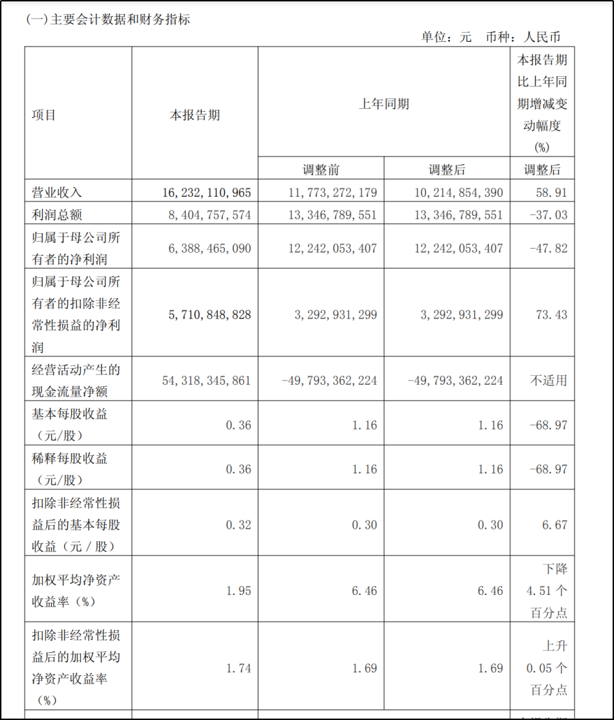 值得注意的是,在营收、扣非净利润大幅增长的背景下,国泰海通当期利润出现明显收缩。一季报数据显示,公司利润总额同比下降37.03%,归母净利润同比大跌47.82%,基本每股收益同比下滑68.97%,加权平均净资产收益率同步回落4.51个百分点。对于盈利指标下滑,国泰海通解释称,上年同期吸收合并海通证券产生负商誉,使得上年同期营业外收入较高。